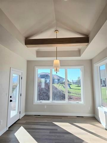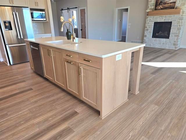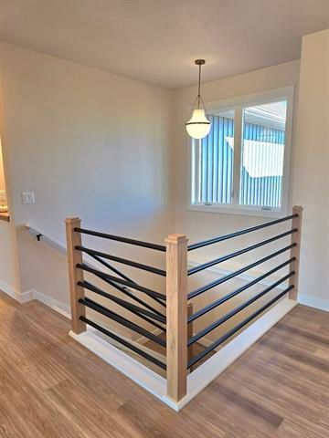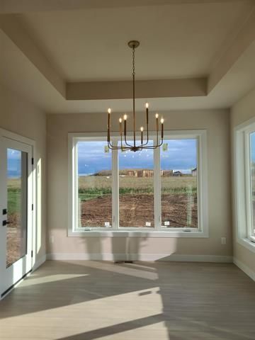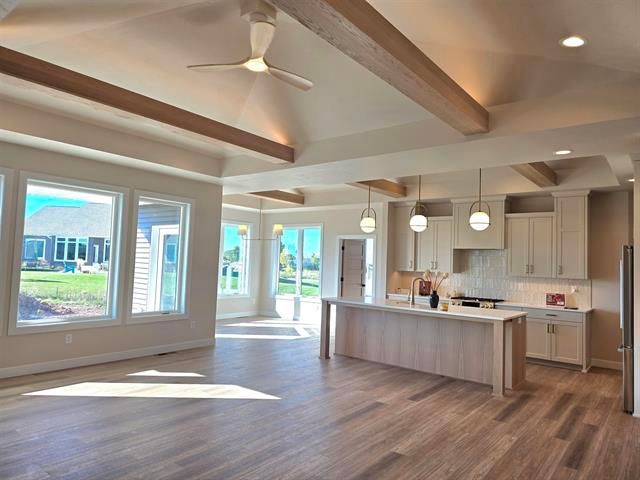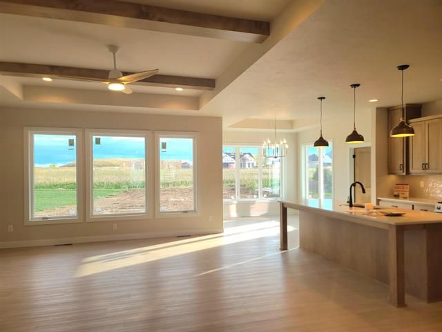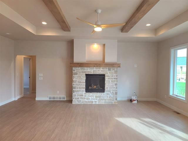 Open concept floor plan, back patio and covered porch, 2- 60x48 egress windows in the basement, garage to basement assess, nice size dining room, living room, white painted trim, base and doors, gas fireplace with natural stone surround, beams in living room ceiling, 9 ft wall heights, tray in dining, great room and primary bedroom, hardsurface floors throughout, quarts countertops, custom cabinets, tile backslash, full tile walk-in shower, 8ft front door, covered front porch with decorative beams, upgraded siding, alliance casement windows, upgraded lighting package, butler's pantry with butcher block countertop, drop station in back entrance area with bench and hooks, metal railings and appliance package in kitchen, partial concrete drive and A/C.